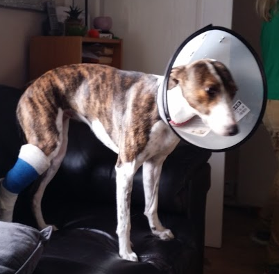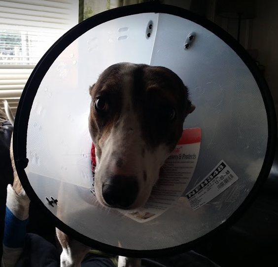 We wandered off after that, but here’s the wee survivor in her The Cone of Shame(tm).
